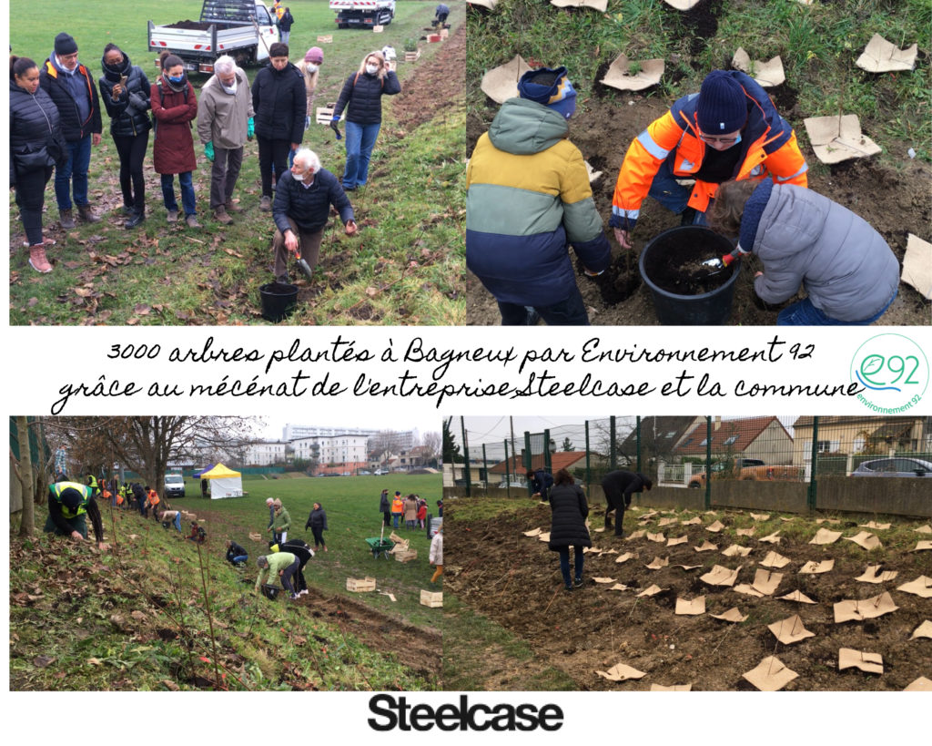 3000 arbres de 24 variétés ont été plantés en ce mois de décembre 2021 à Bagneux grâce à l’énergie déployée par Irène Nenner, notre présidente. La ville de Bagneux a financé à hauteur de 20.000 euros l’opération et mis à disposition ses jardiniers. L’autre moitié de l’opération a été financée par une entreprise locale privée STEELCASE (leader du